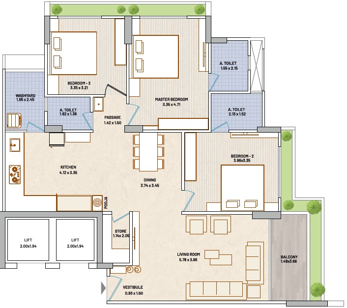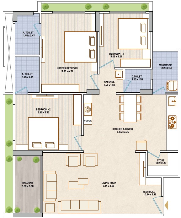 Bedroom 3 BHK Flat |